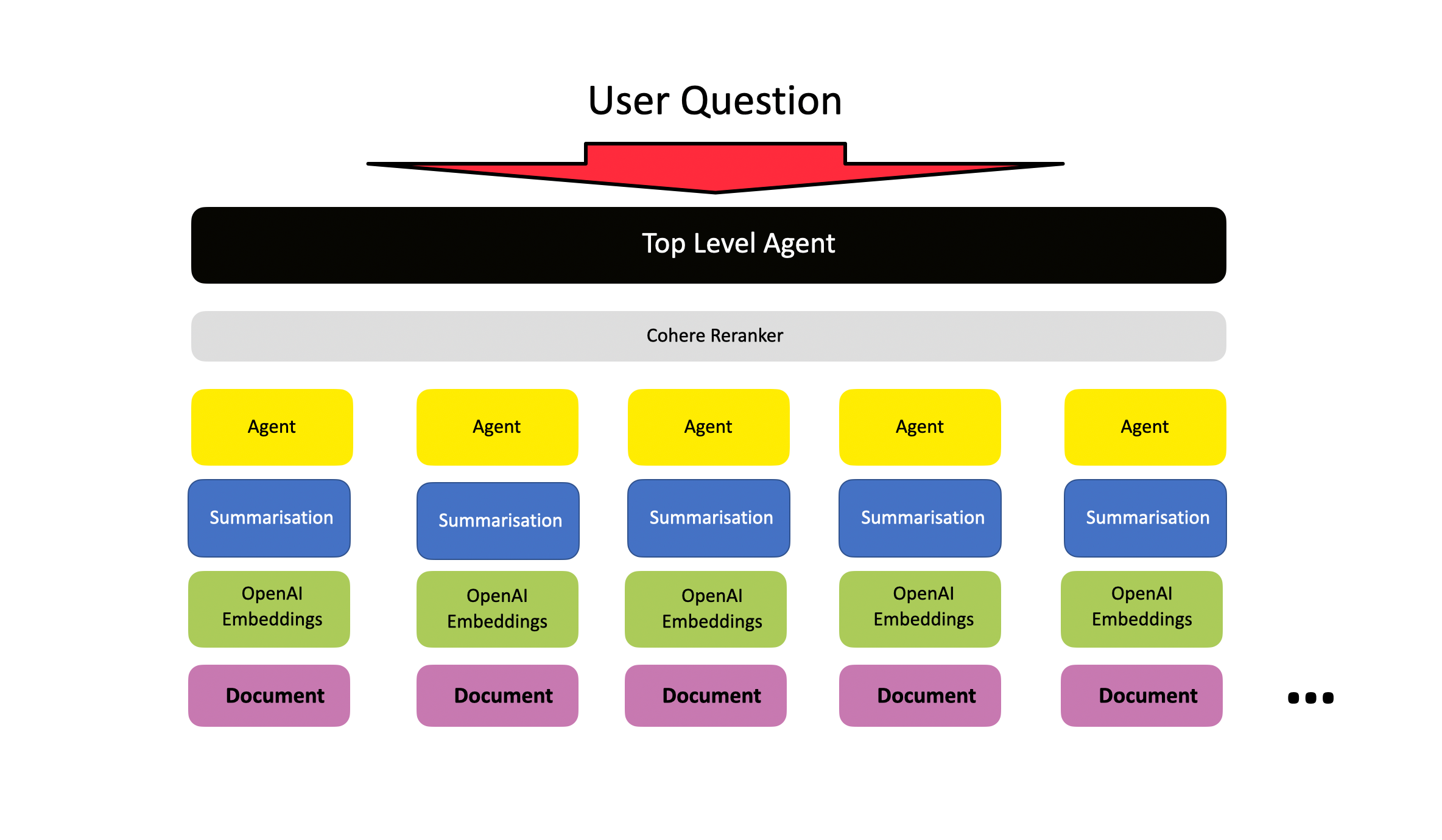 The large corpus of data is broken up into smaller documents. An agent is created for each document, and each of the numerous document agents have the power of search via embeddings and to summarise the response.