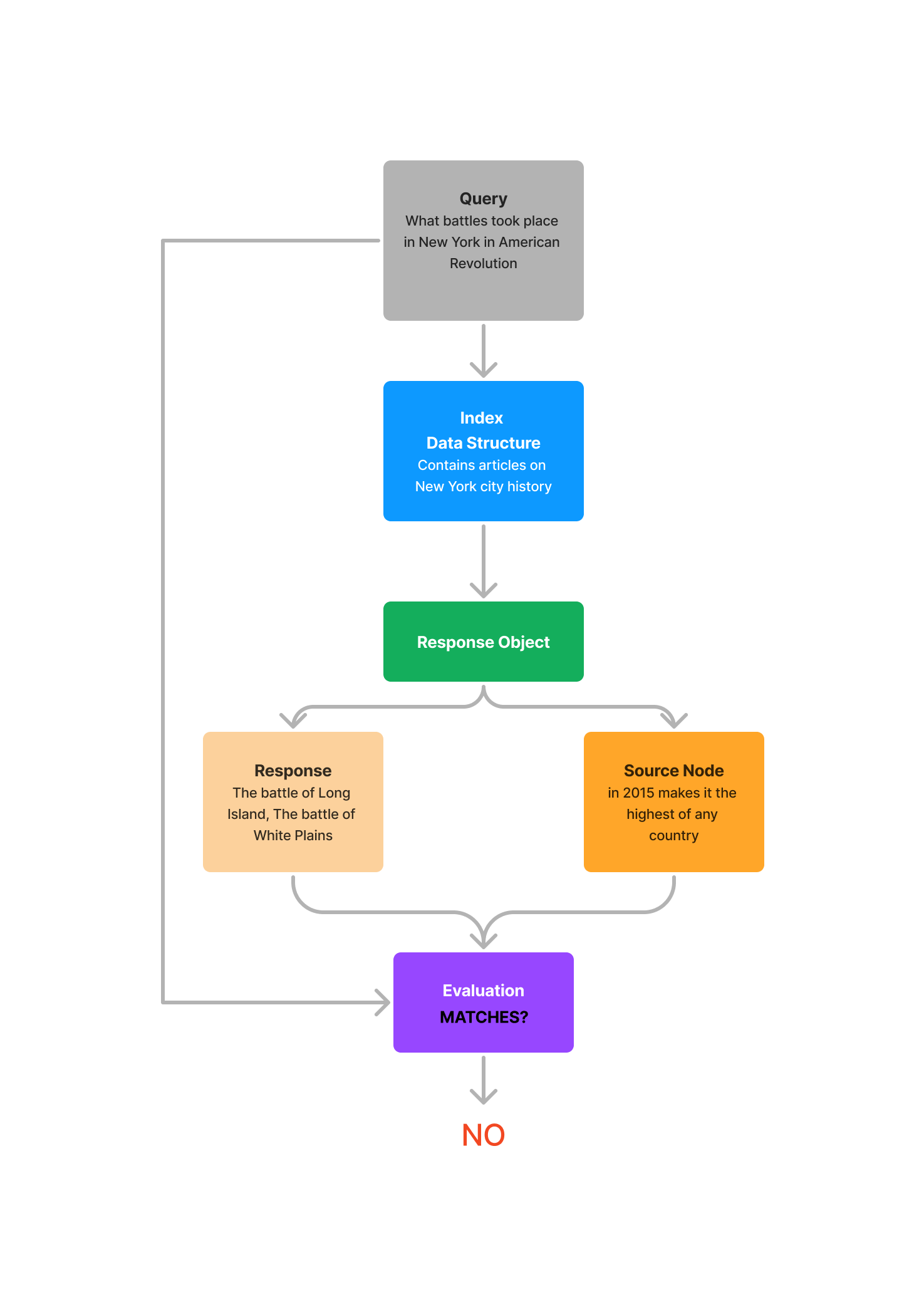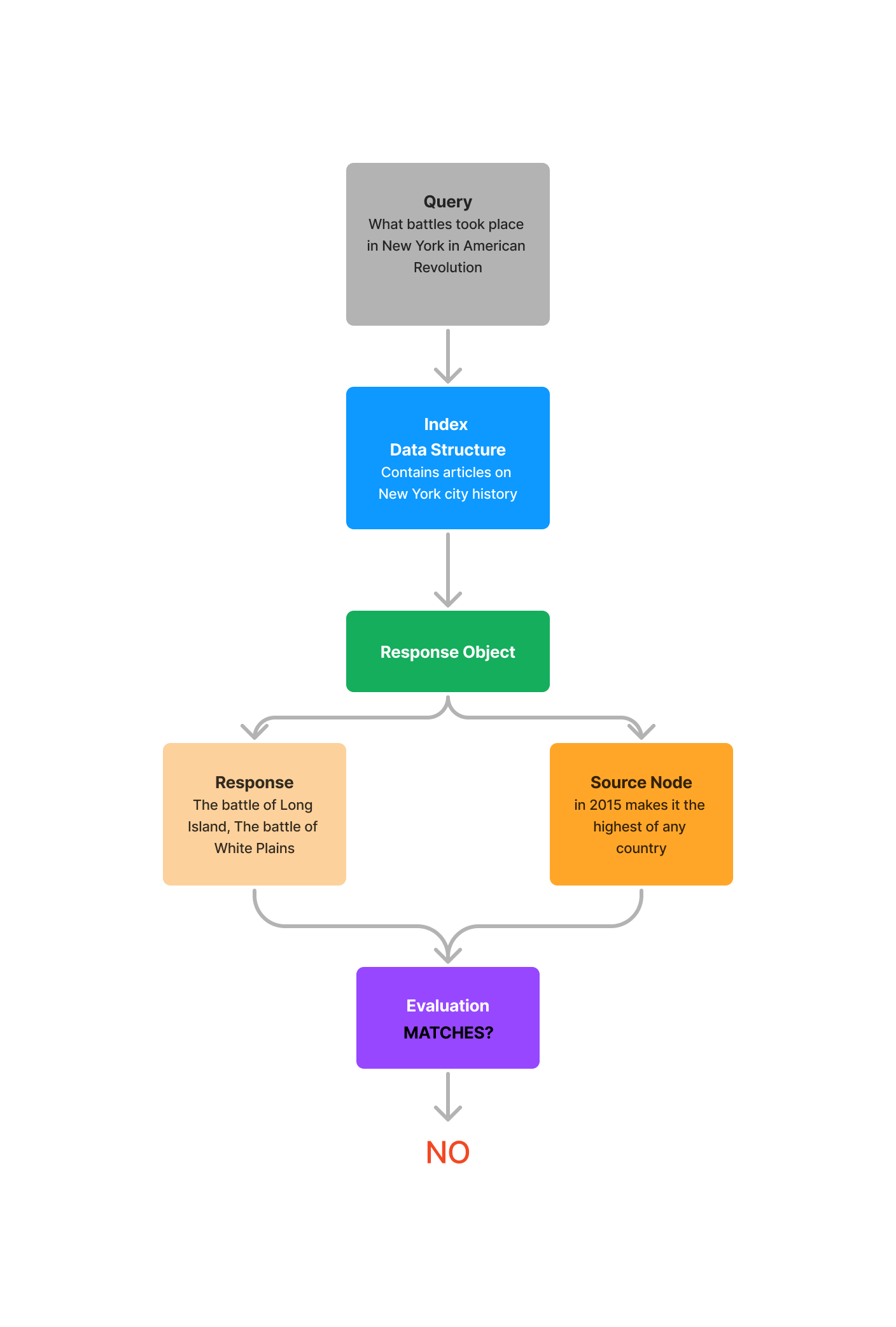 The response object for a given query returns both the response and source nodes (context) with which it generated the response. We can now evaluate the response against the retrieved sources — without taking into account the query! This allows you to measure hallucination — if the response does not match the retrieved sources, this means that the model may be “hallucinating” an answer since it is not rooting the answer in the context provided to it in the prompt.