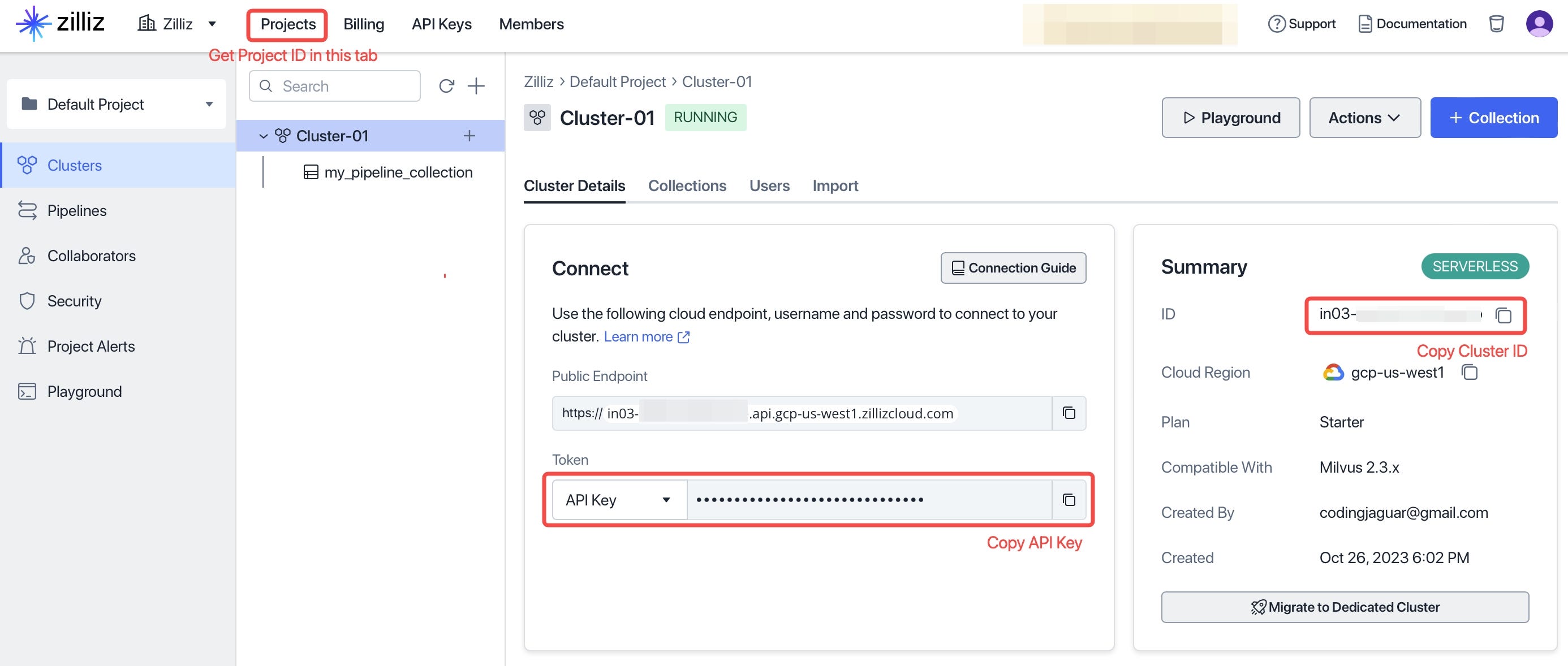 zcp_index.create_pipelines(metadata_schema={"user_id": "VarChar", "version": "VarChar"})You can copy the Project ID, Cluster ID and API Key from your Zilliz account as follows: