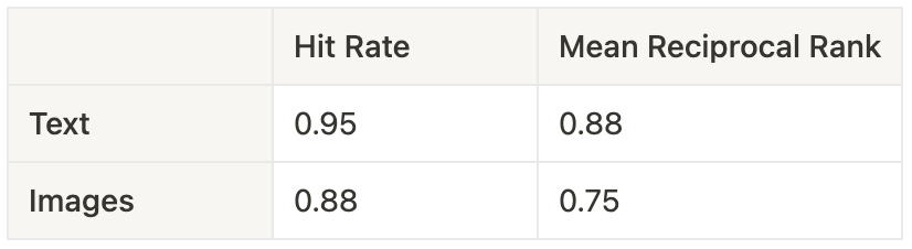 Hit Rate Mean Reciprocal Rank Text 0.95 0.88 Images 0.88 0.75