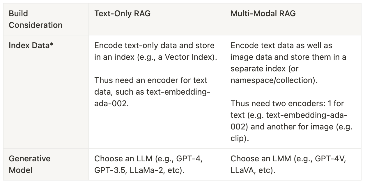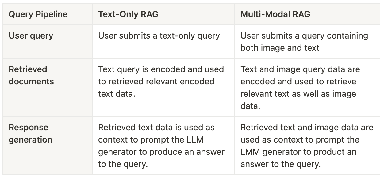 Let’s consider the main differences between multi-modal and text-only RAG. Below are two tables that describe the RAG build considerations as well as query-time pipeline and compares and contrasts multi-modal and text-only cases against them.