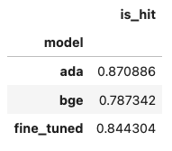 In terms of hit-rate metric, the base model gets 78% hit-rate on the validation dataset, and the fine-tuned model gets 84%. text-embedding-ada-002 gets 87%, which means that our fine-tuned model is only 3% off!
