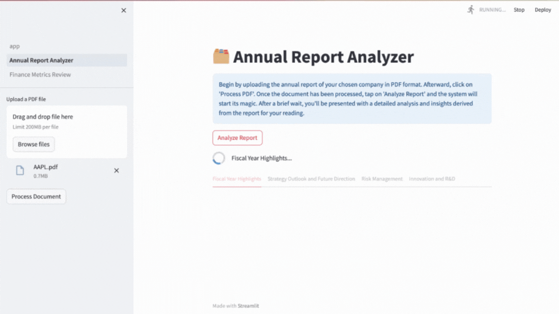In summary, FinSight’s Annual Report Analyzer makes financial analysis easier and more insightful by harnessing the power of LLMs. It’s a valuable tool for portfolio managers, financial analysts, and shareholders, saving time and improving decision-making. While the core pipeline remains consistent, note that our deployed app code might evolve to incorporate upgrades and enhanced features, ensuring ongoing improvements.