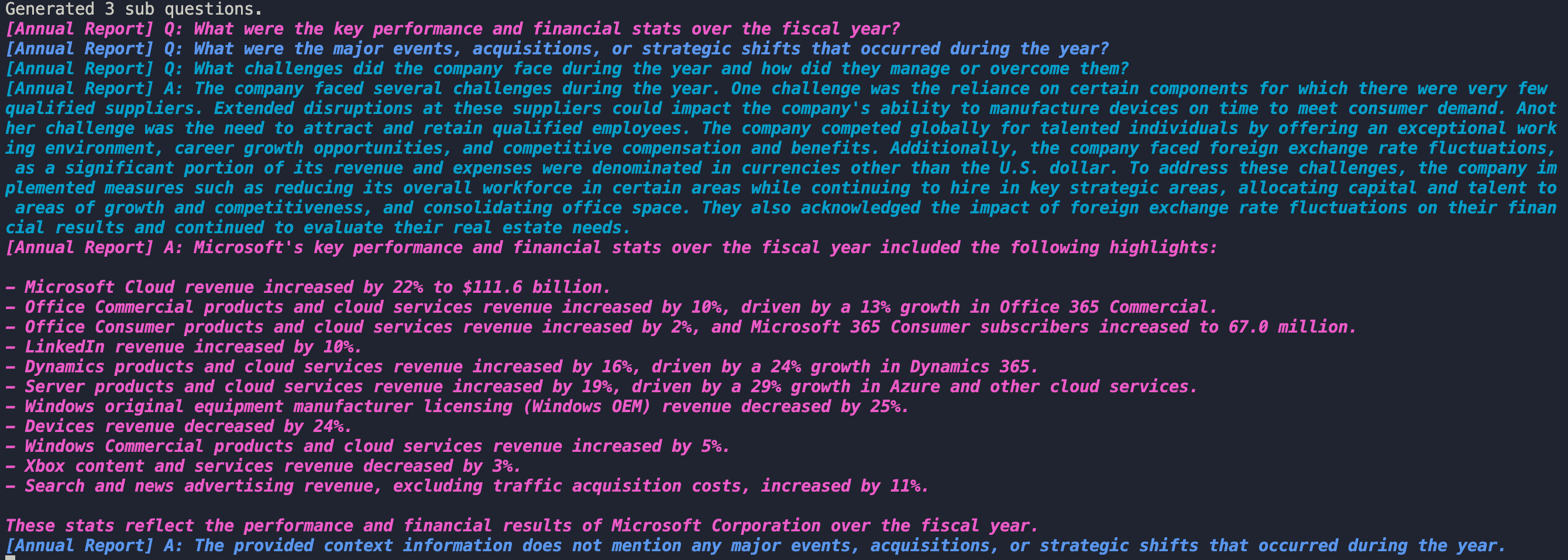 Ideally, the above code should have been enough to query and synthesize a response from the information in the vector DB. However, the response wouldn't be comprehensive and detailed enough, especially for such open-ended questions. We need to develop a better mechanism that allows us to break down a query into more detailed questions and retrieve context from multiple parts of the vector DB.