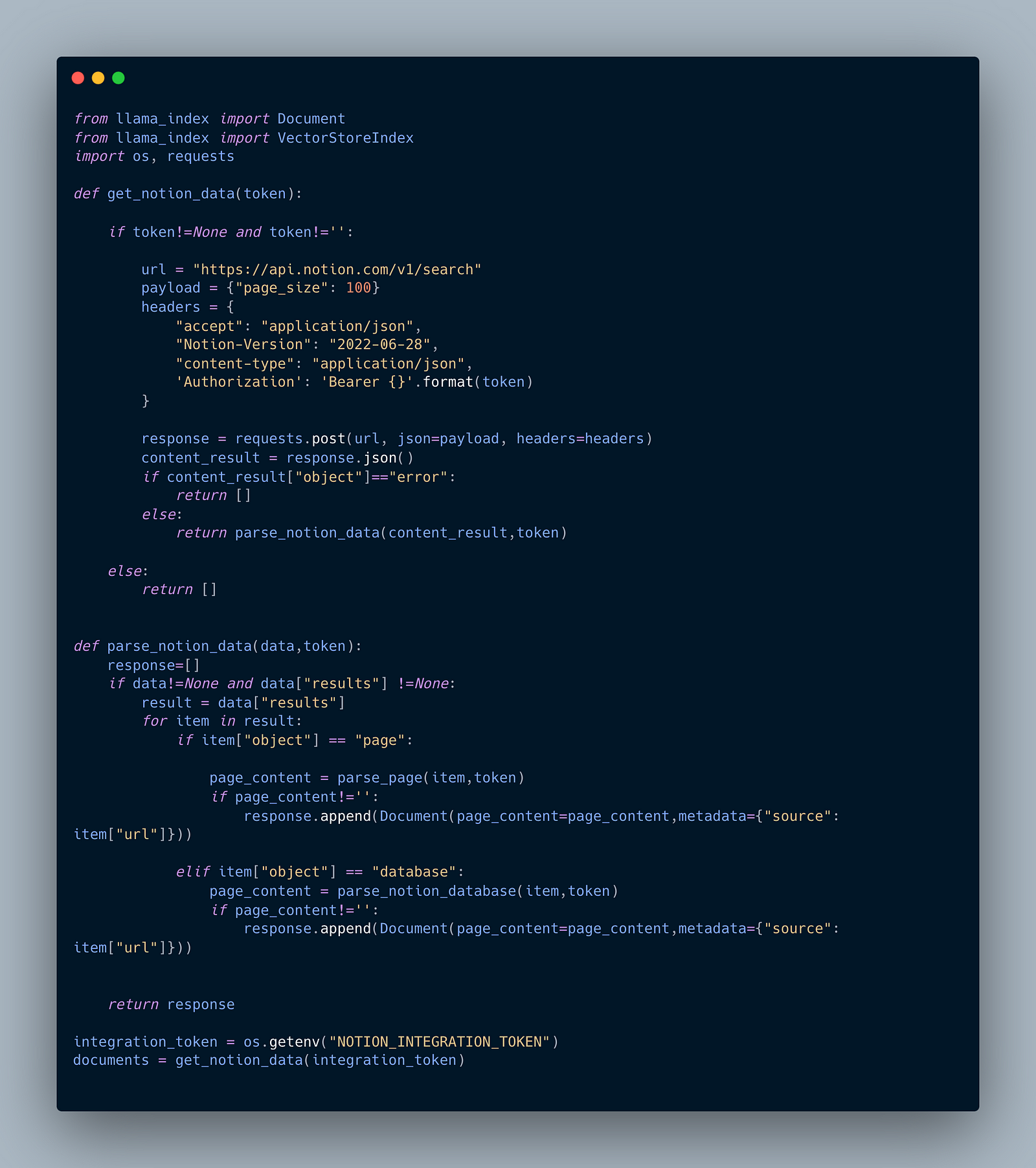 - Using the Notion API, parse data from Notion and generate LlamaIndex documents