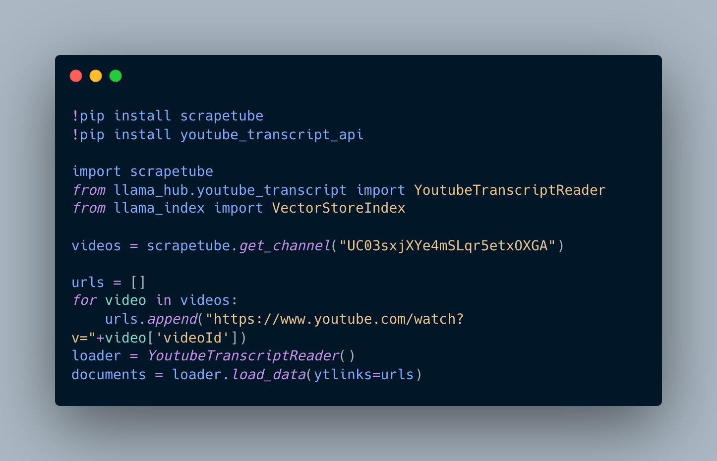 scrapetubeand pass it your channel ID to get your list of videos - Install the Youtube transcript api and pass the video URLs from above to LlamaIndex loader to get a list of documents