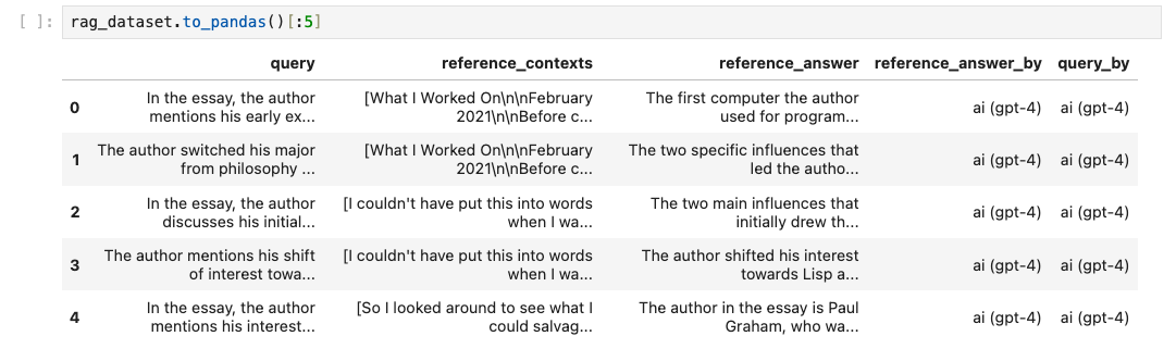 rag_dataset = LabelledRagDataset(examples=[rag_example, rag_example_2])You can also synthetically generate a dataset over any document corpus with GPT-4: