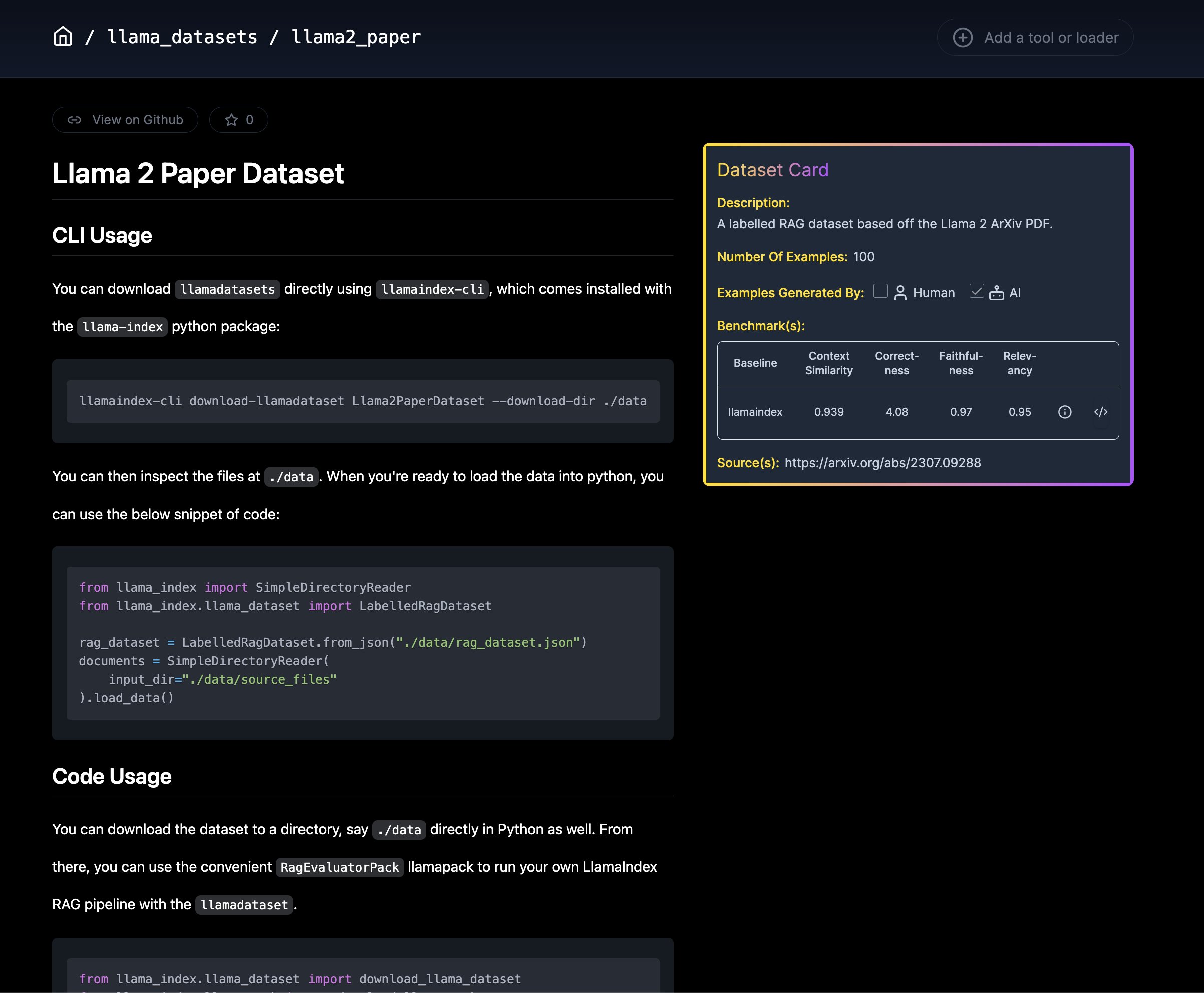 card.json) andREADME.md: These will be shown on the LlamaHub page for this dataset. If you want to auto-generate this given some inputs, check out ourLlamaDatasetMetadataLlamaPack. - Submit a PR into