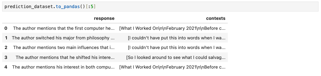 Generating predictions over the RAG dataset is straightforward. You can easily plug in any query engine into amake_predictions_with :