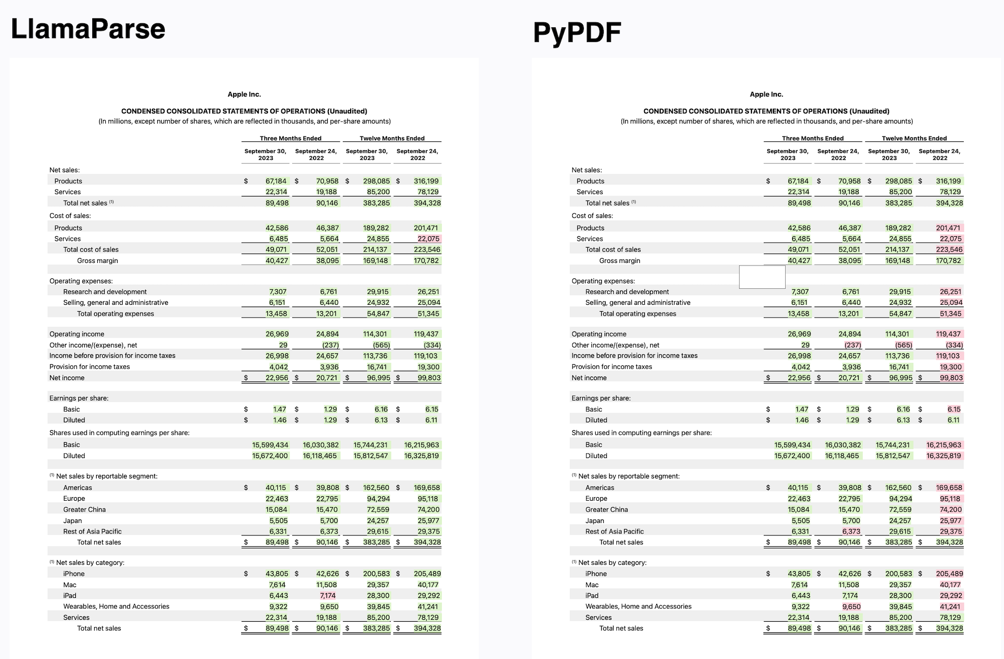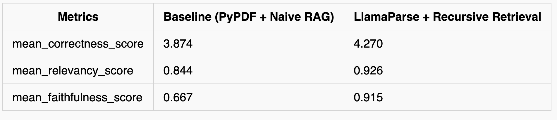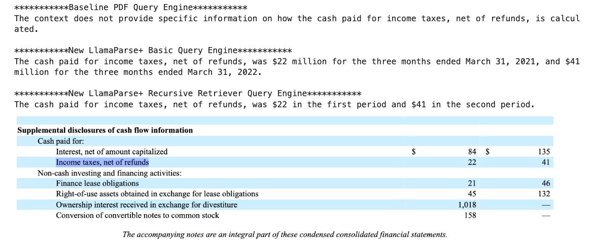 This is where LlamaParse comes in. We’ve developed a proprietary parsing service that is incredibly good at parsing PDFs with complex tables into a well-structured markdown format. This representation directly plugs into the advanced Markdown parsing and recursive retrieval algorithms available in the open-source library. The end result is that you are able to build RAG over complex documents that can answer questions over both tabular and unstructured data. Check out the results below for a comparison: