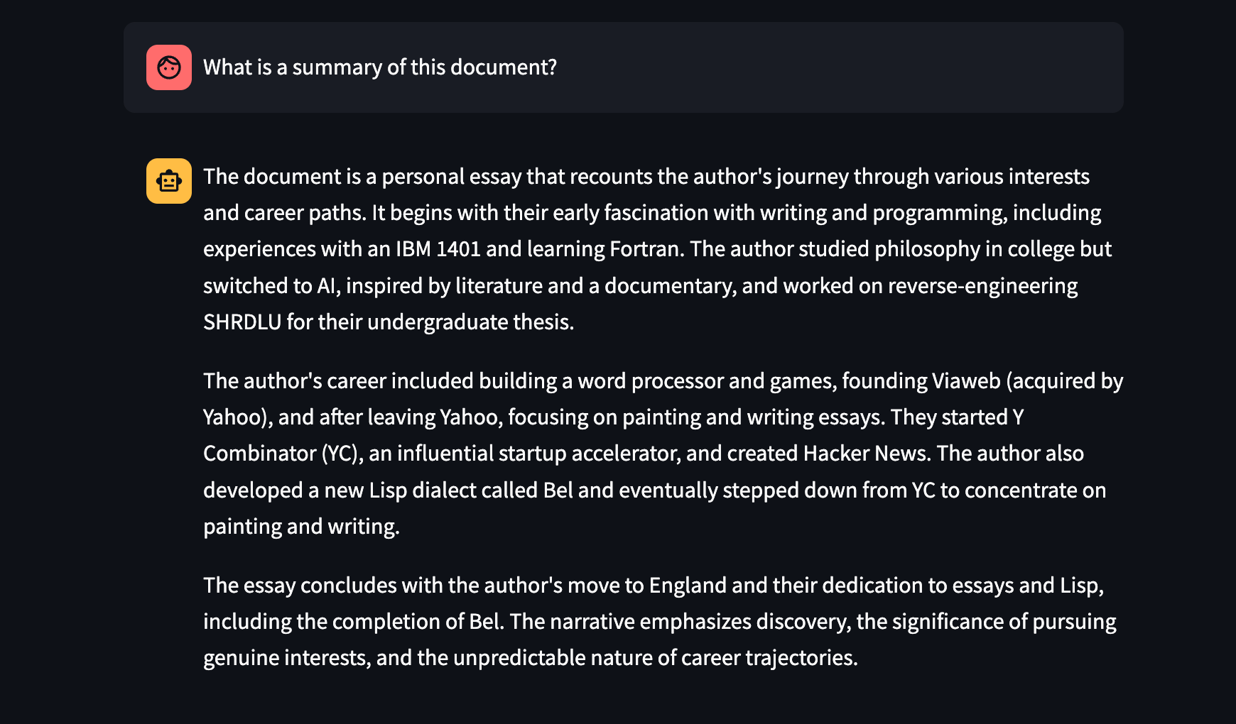 Now we can ask questions! We can ask both specific questions as well as summarization questions.