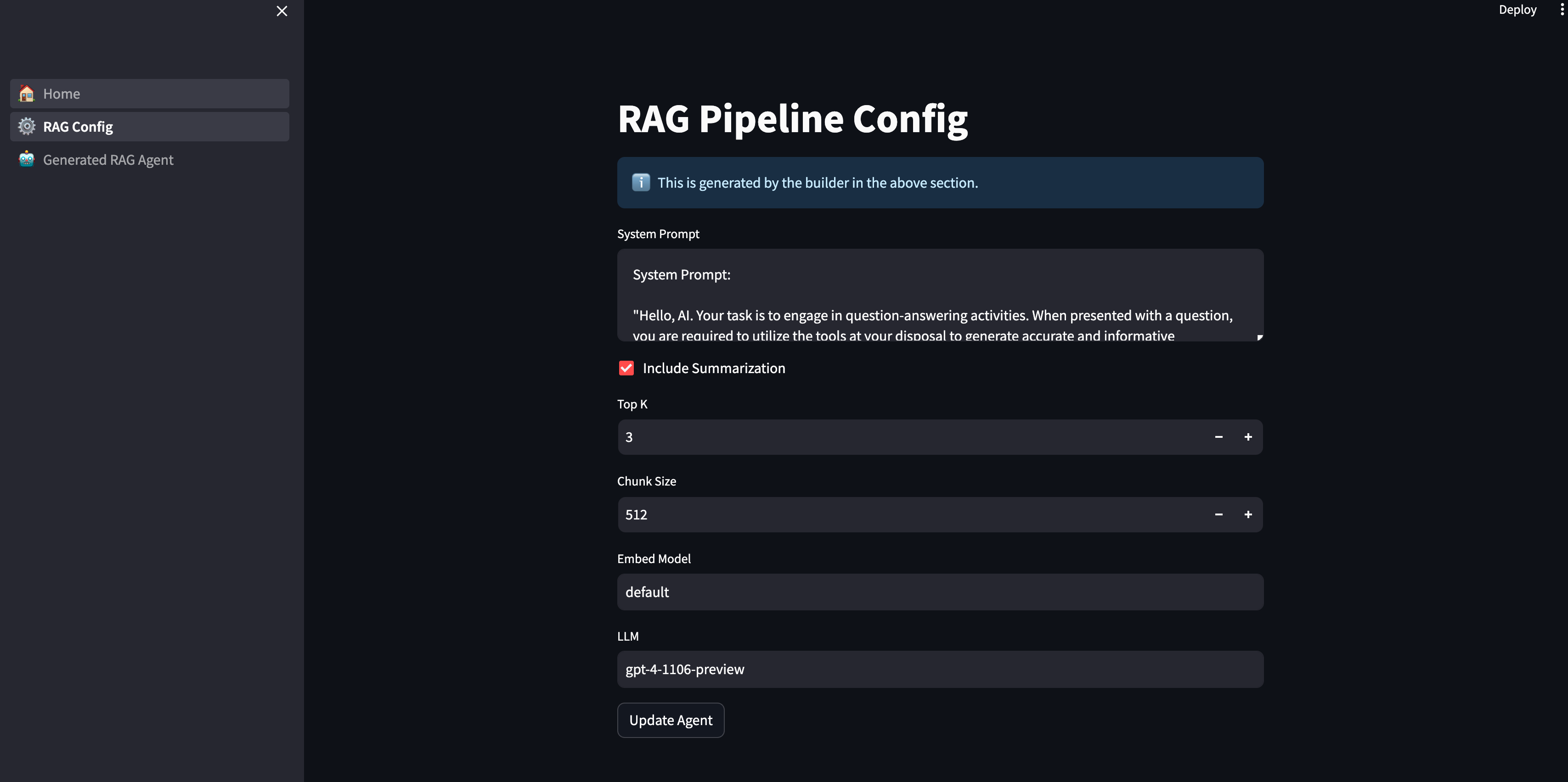 - Configurable Settings: Dive into the configuration view to see and alter the automatically generated parameters, such as top-k retrieval, summarization options, and more.