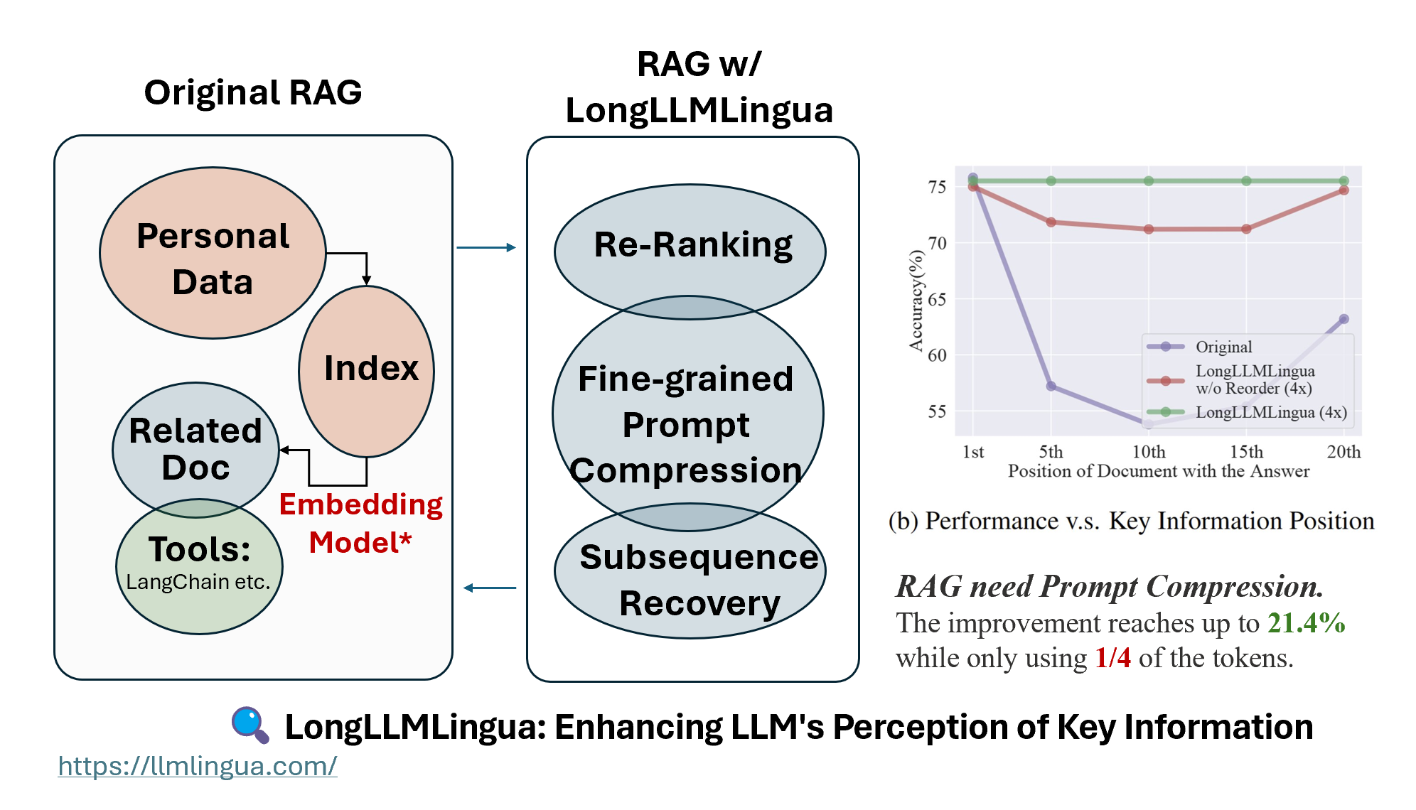 In the RAG, after the retrieval phase, it’s necessary to perform Re-ranking + Fine-Grained Prompt Compression + Subsequence Recovery to enhance LLM’s perception of key information, which is LongLLMLingua.
