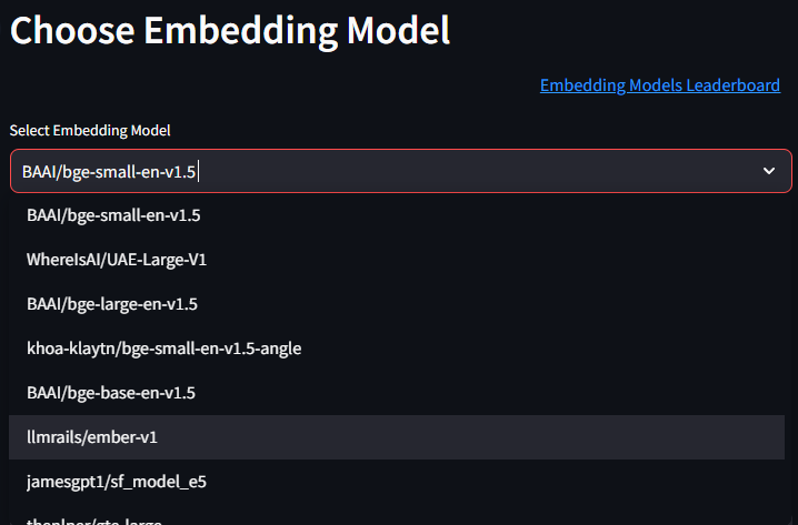 Offers a dropdown for users to select the embedding model of their choice from a predefined list. I have included some of the top embedding models from Hugging Face’s MTEB leaderboard. Near the dropdown I have also included a handy link to the leaderboard where users can get more information about the embedding models.