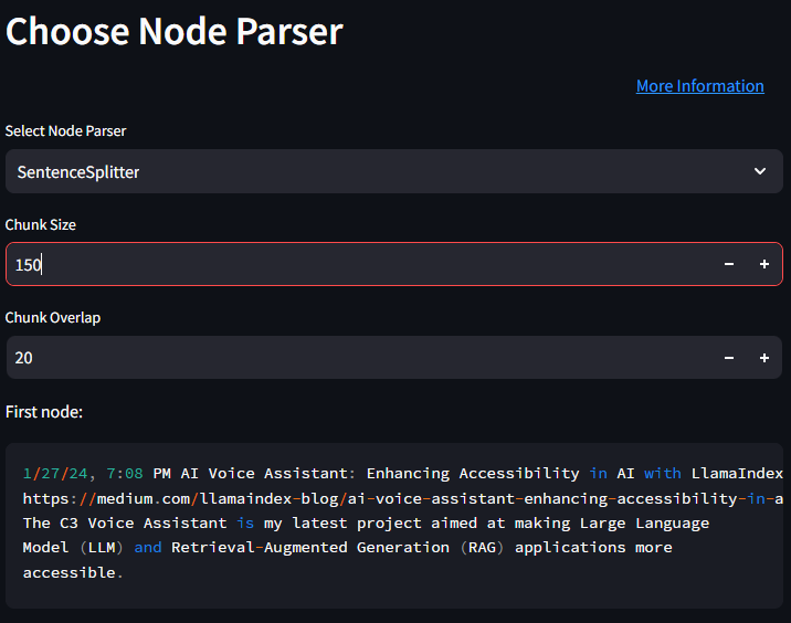 This function allows users to choose a node parser, which is instrumental in breaking down documents into manageable chunks or nodes, facilitating better handling and processing. I have included some of the most commonly used node parsers supported by Llamaindex, which include SentenceSplitter, CodeSplitter, SemanticSplitterNodeParser, TokenTextSplitter, HTMLNodeParser, JSONNodeParser and MarkdownNodeParser.