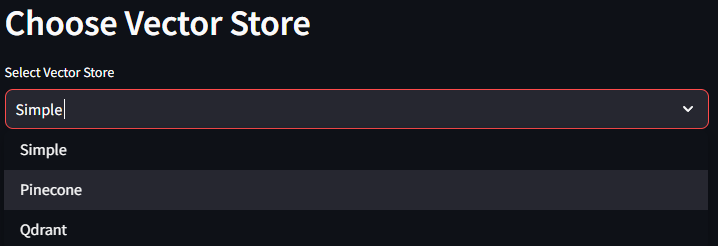 Enables users to choose a vector store, which is a critical component for storing and retrieving embeddings in the RAG pipeline. This function supports the selection from multiple vector store options including Simple (Llamaindex default), Pinecone and Qdrant.