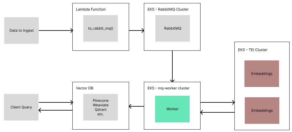 This is where the real meat of work comes in. We need to create a consumer that will endlessly pull from our RabbitMQ queue, ingest data with the help of TEI, and then put that data into our vector db.
