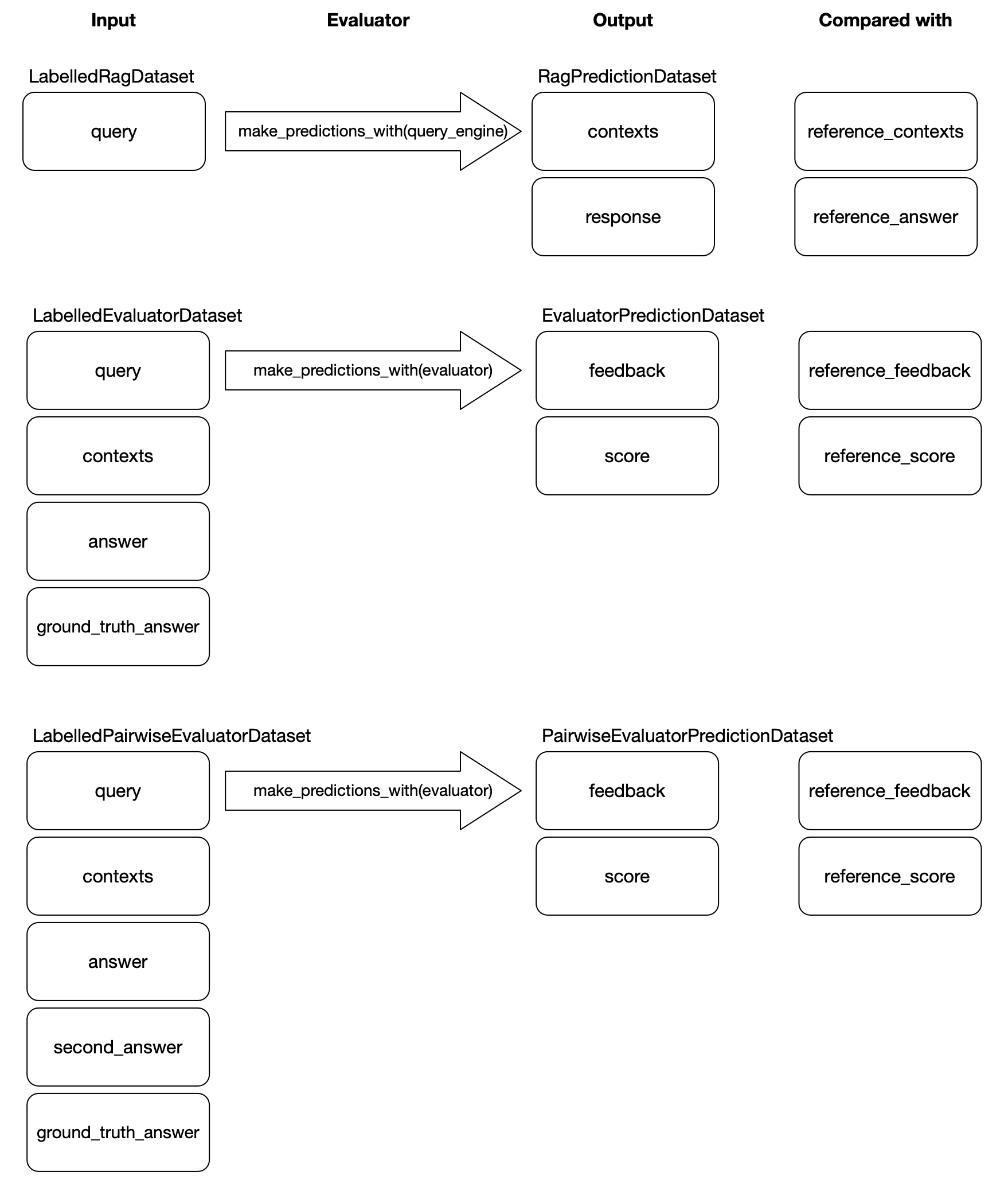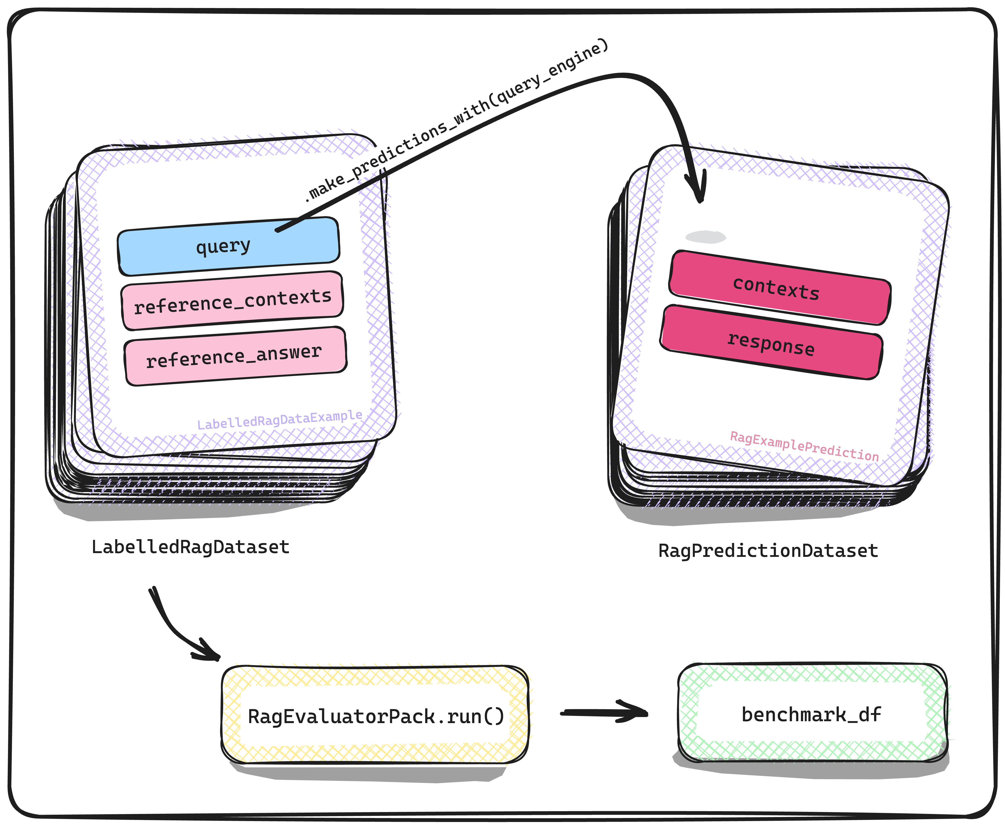 Before getting into the new llama-datasets, recall that with LabelledRagDataset our end goal was to use it to evaluate or benchmark a Retrieval-Augmented Generation (RAG) system. The way to do that with our llama-dataset abstractions is to build a QueryEngine (i.e., a RAG system) and then use it to make “predictions” over the LabelledRagDataset. With the predictions in hand, we can evaluate the quality of these predictions by comparing it to the corresponding reference attributes of the LabelledRagDataset.