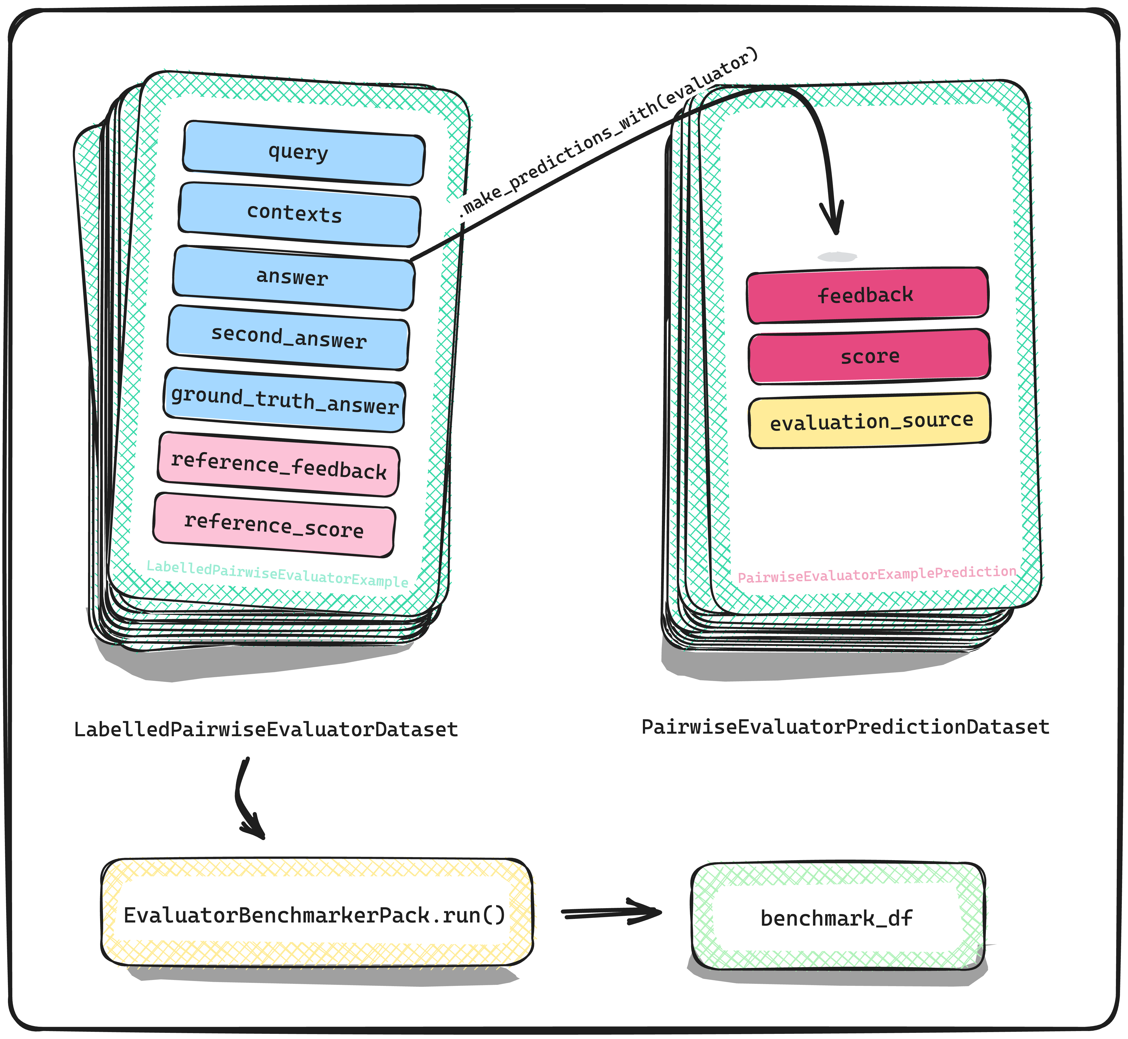 The second llama-dataset we’re introducing today can be considered an extension of the first one. The LabelledPairwiseEvaluatorDataset is similarly used for benchmarking an LLM evaluator. However, there is a subtle difference in the evaluation task as here the LLM evaluator compares two generated answers from two separate LLMs. Outside of this difference, the flow for using this llama-dataset to benchmark an evaluator remains the same.