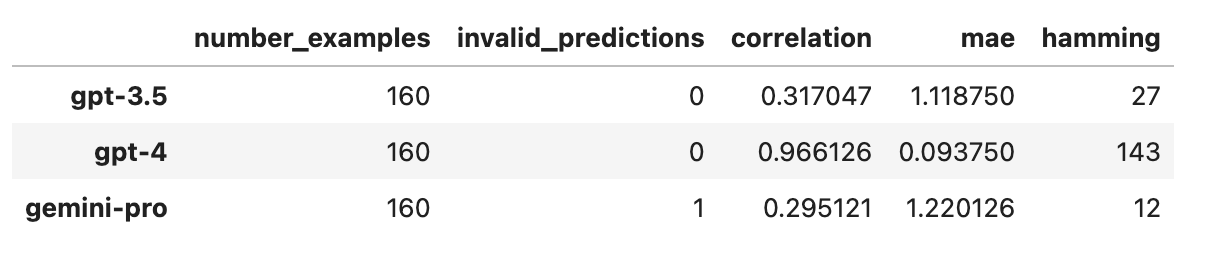 This llama-dataset is a LabelledEvaluatorDataset and is a miniature version of the MT-Bench single-grading dataset. In particular, we consider all of the 160 original questions (i.e., 80 x 2, since MT Bench is a two-turn question dataset), but only the responses produced by Llama2-70b. For the reference evaluations, we use GPT-4. As with the original LabelledRagDataset, we’ve produced a new llama-pack EvaluatorBenchmarkerPack (of course, also made available in today’s release!) to make benchmarking an LLM evaluator on the new llama-datasets relatively effortless. The below snippet of code is how you can replicate the results of this benchmark