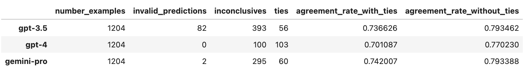 - Gemini Pro and GPT-3.5 seem to be a bit more assertive than GPT-4 resulting in only 50–60 ties to GPT-4’s 100 ties.